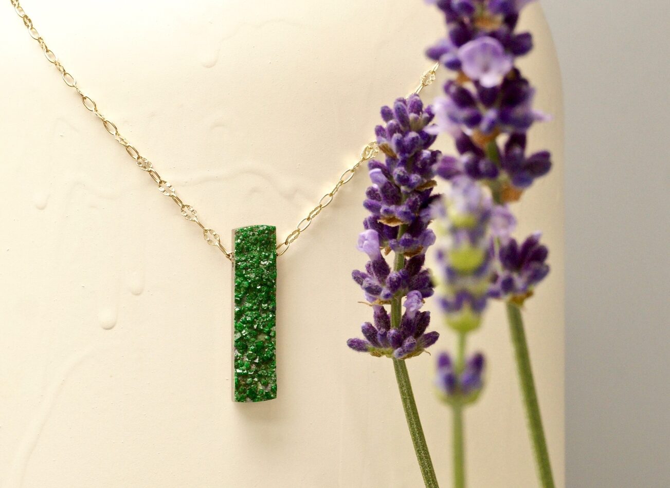 This gorgeous necklace is a druzy uvarovite, otherwise know as green garnet. The crystal structure is a natural druzy, meaning the crystalline structure is so small that it glimmers in the light. Druzy uvarovite is a powerful crystal to heal your heart. Especially if you’ve recently experienced a major loss. Uvarovite supports you to let go of the past and also connects you to the energy of the Universe. This beautiful, rectangular shaped amulet hangs on a decorative gold filled chain with a heart lobster clasp and an extension, adjustable from 18″ to 20 1/2″ long. The crystal is from Russia and measures 8mm x 30mm.