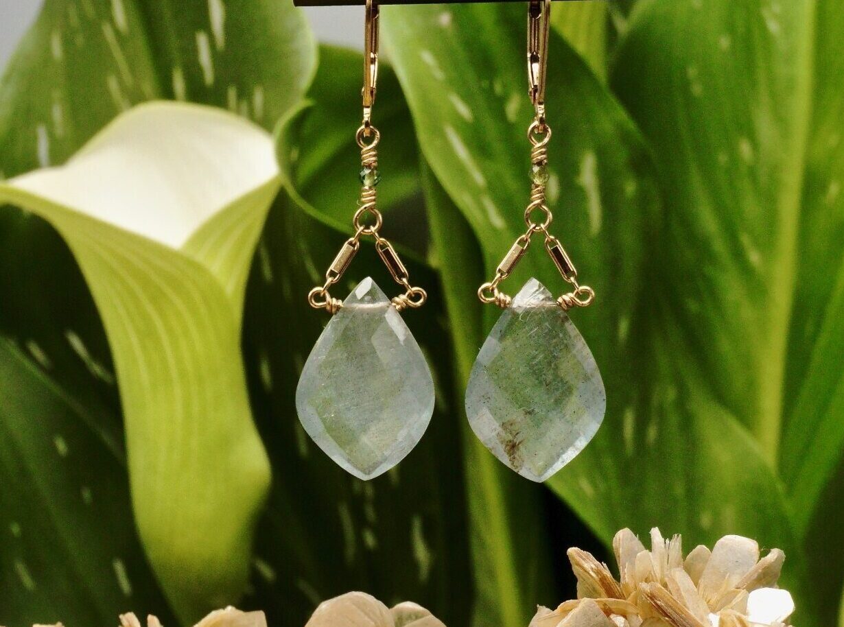 Everyone needs aquamarine crystal in their arsenal. It is a perfect crystal to wear during times of stress. Aquamarine soothes and replenishes, especially during difficult times. It also harmonizes your surroundings and brings deep peace. These rare, gorgeous faceted crystal drops are from Africa. They hang on gold filled bar chain with an aquamarine accent bead connecting at the top. These unique earrings are 2″ long and are secured with lever backs. Crystals measure 13mm x 19mm.