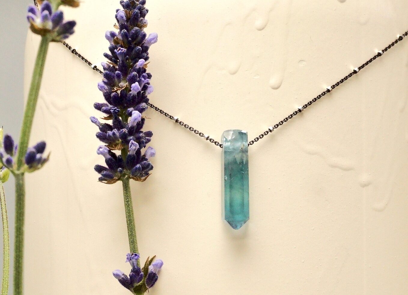 This is such a very special fluorite crystal! The color is a beautiful, natural bright and subtle shades of blue. Fluorite is the best crystal I have found for clearing energy and static, including electromagnetic waves from technology. It will also relieve tension and stress. This one of a kind crystal hangs on a beaded oxidized silver chain with a spring clasp, 20″ long. Crystal measures 7mm x 25mm.