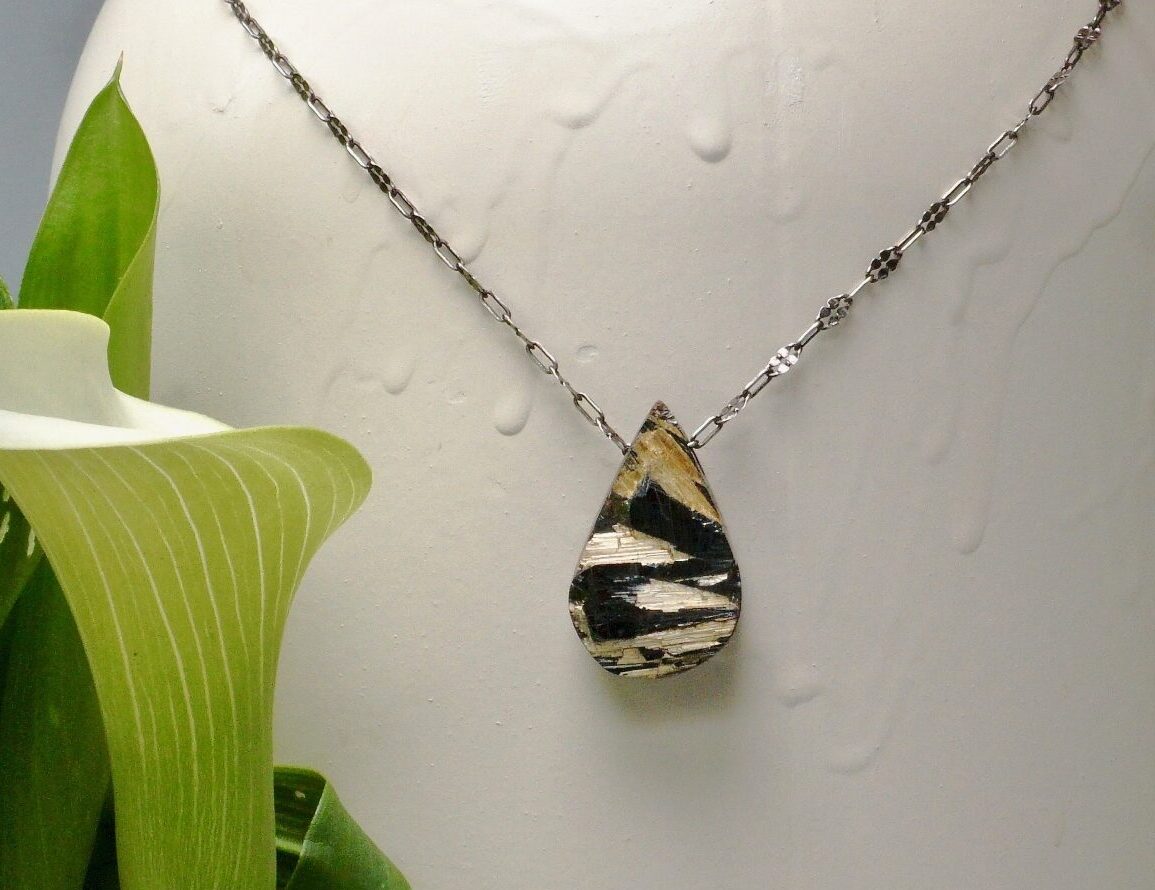 This is a very powerful gold rutilated quartz crystal. It is from Brazil and has the combined energy of hematite, as well. This crystal connects strongly to the spiritual world. It helps you manifest the creative desires in your life. A very special crystal and necklace! It hangs on a decorative oxidized silver chain with a heart lobster clasp and an extension, adjustable 18 1/2″ – 21 1/2″. Crystal measures 16mm x 25mm.