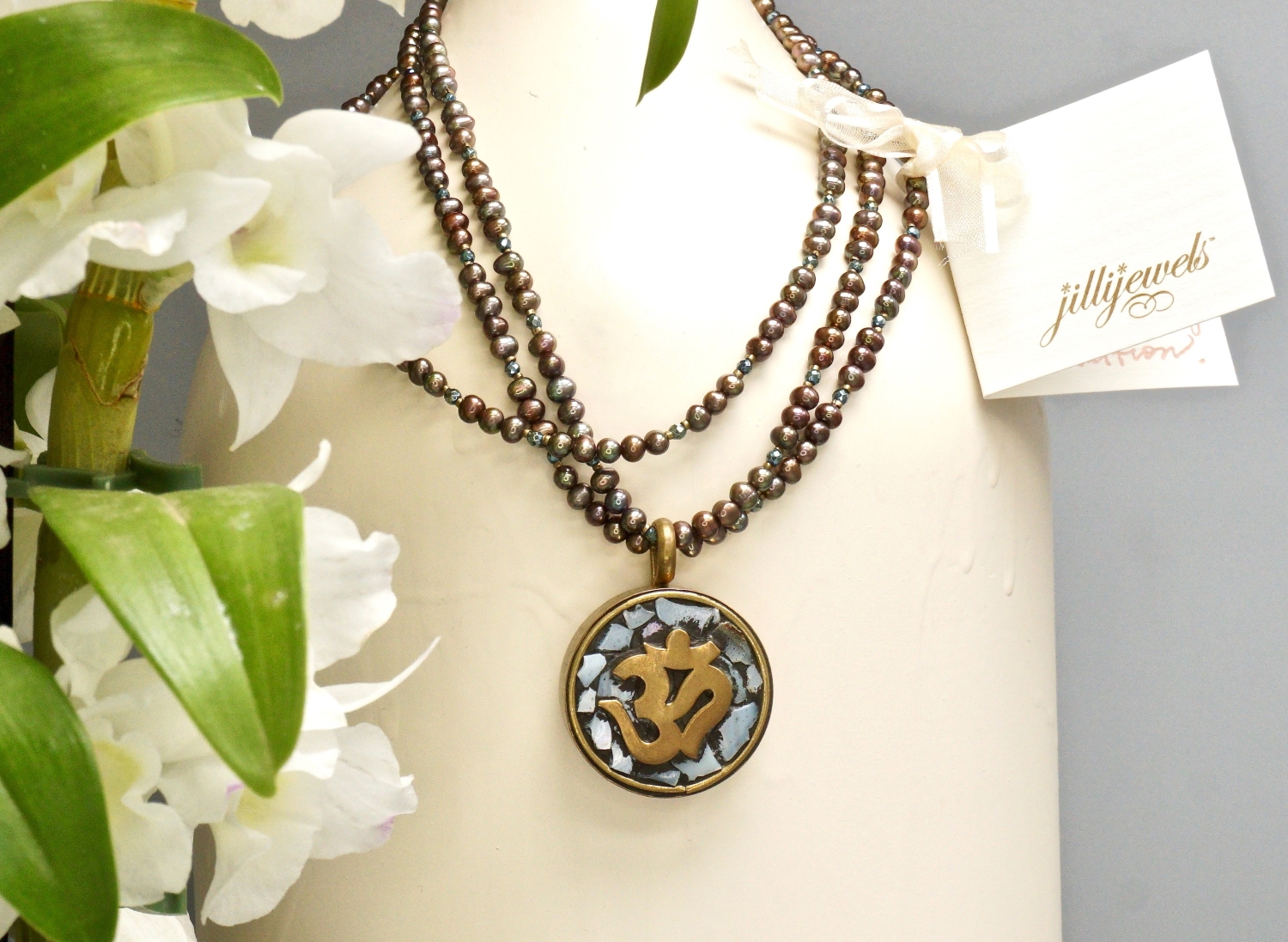 This om pendant necklace is such a fabulous piece! Made in Tibet by an artisan, it is truly a special pendant. The om design is brass and set in mother-of pearl. Om is the sacred sound of creation and Oneness. The mother-of-pearl provides protection and safety in travel. The pendant hangs on a long strand of pearls with hematite and tiny brass beads interspersed. Pearls manifest successful, loving relationships. It is secured by a heart clasp and extension, 38″ – 41″ so can also be worn doubled. or removed from the bail of the pendant and worn alone, making the pendant available to hangs on another chain or rope. Om pendant measures 1″ in diameter.